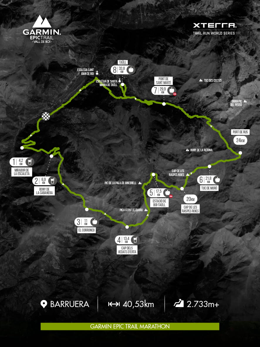 The Garmin Epic Trail Vall de Boí 42K is a marathon distance race on a technical and spectacular route with 2,800 m of positive elevation gain and a total of 5,600 m of accumulated elevation gain. It consists of a circular itinerary through the peripheral area of the National Park and the mountains that surround the Vall de Boí.